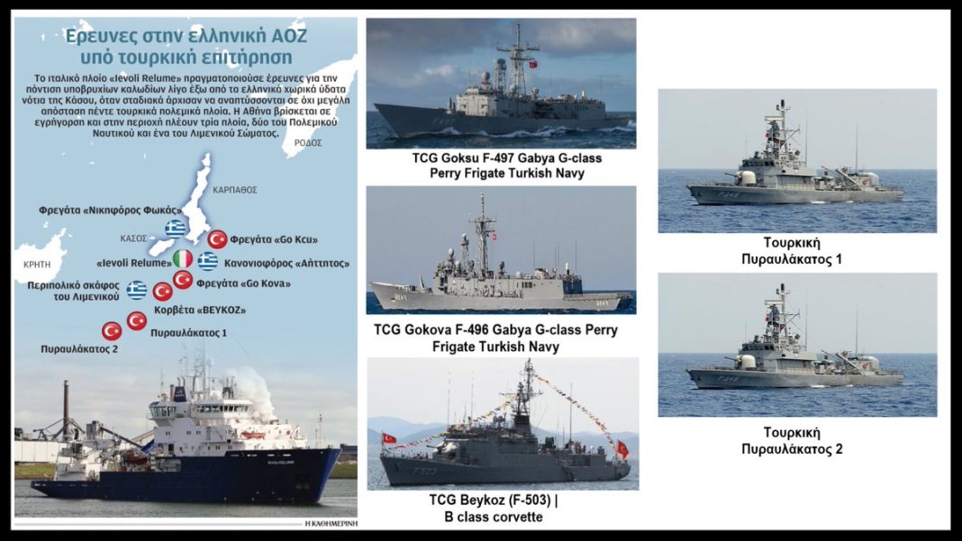 Εκεί συγκεντρώθηκαν και πέντε πολεμικά πλοία της Τουρκίας (δύο φρεγάτες, δύο πυραυλάκατοι και μία κορβέτα), στήνοντας ένα σκηνικό έντασης και πολιορκίας του ελληνικού νησιού, υπό το πρόσχημα της… παραβίασης της τουρκικής υφαλοκρηπίδας!