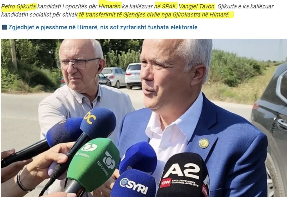 Ο Πέτρος Γκικουρίας, ο υποψήφιος της αντιπολίτευσης για τη Χειμάρρα, επικοινώνησε με την Ειδική Υπηρεσία κατά της Διαφθοράς και του Οργανωμένου Εγκλήματος – SPAK, καταθέτοντας τις αντιρρήσεις του κατά του Βαγγέλη Τάβου, υποψήφιο υποστηριζόμενου από τον Έντι Ράμα.