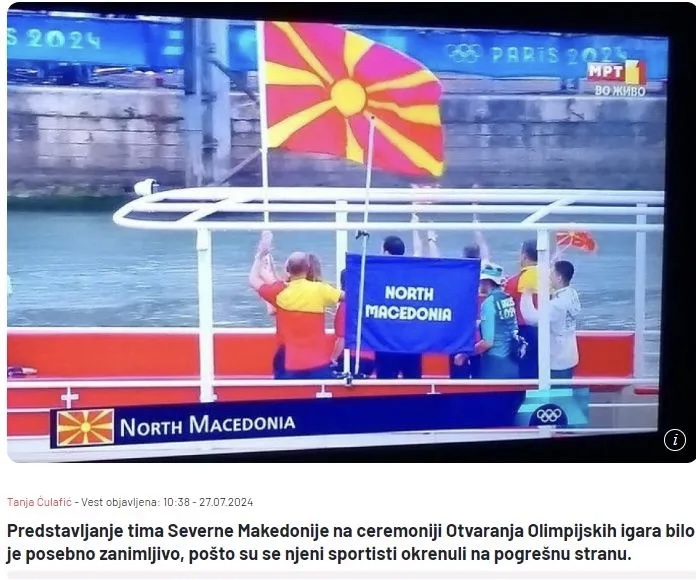 Γέλιο προκάλεσαν στο παγκόσμιο κοινό οι Σκοπιανοί αθλητές της στην τελετή έναρξης των Ολυμπιακών Αγώνων στο Παρίσι, καθώς οι αθλητές της στράφηκαν σε λάθος πλευρά για να χαιρετίσουν!, γράφει η σερβική sportal blic χαρακτηρίζοντας το περιστατικό ως ‘γκάφα’.