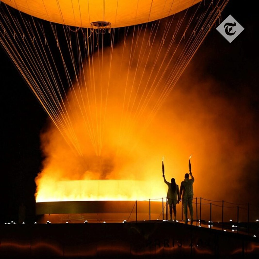Η τεράστια φωτιά άναψε από τους Γάλλους χρυσούς ολυμπιονίκες Marie-José Pérec και Teddy Riner. Στη συνέχεια την τράβηξε ένα αερόστατο θερμού αέρα και η Ολυμπιακή φλόγα ανέβηκε στον νυχτερινό ουρανό του Παρισιού, δημιουργώντας μια μαγική εικόνα.