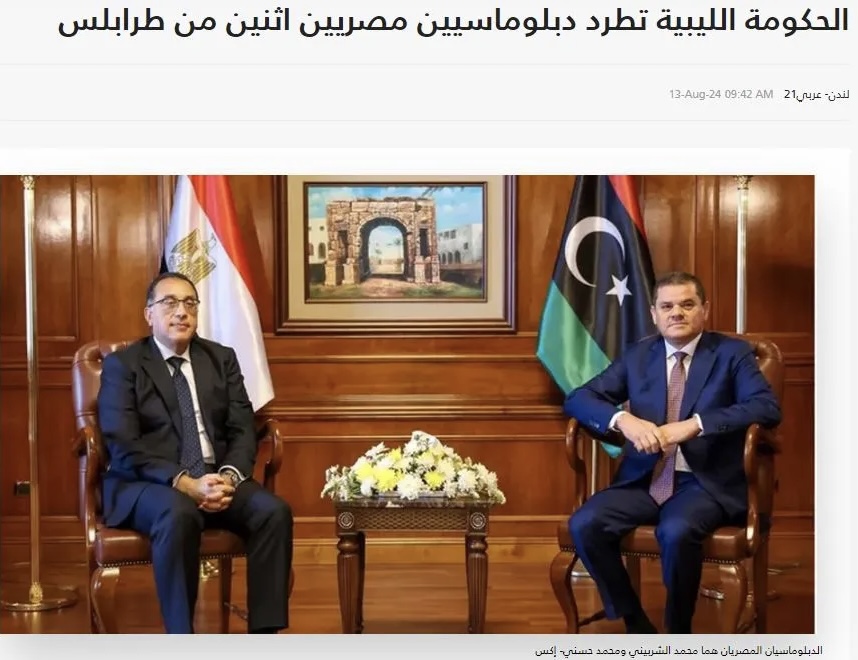 Το υπουργείο Εξωτερικών της κυβέρνησης Εθνικής Ενότητας, ζήτησε από δύο Αιγύπτιους διπλωμάτες να εγκαταλείψουν το λιβυκό έδαφος εντός 72 ωρών, οι οποίοι υπηρετούν ως σύμβουλος και δεύτερος γραμματέας στην αιγυπτιακή πρεσβεία στην Τρίπολη.