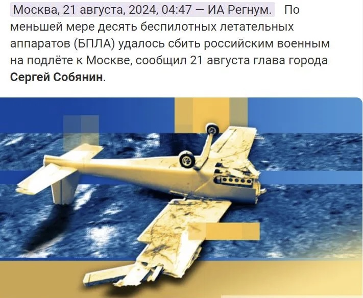 «Τουλάχιστον δέκα μη επανδρωμένα εναέρια οχήματα (UAV) καταρρίφθηκαν από τον ρωσικό στρατό κατά την προσέγγιση στη Μόσχα, δήλωσε ο δήμαρχος της πόλης Σεργκέι Σομπιάνιν στις 21 Αυγούστου», γράφει το ρωσικό Regnum.