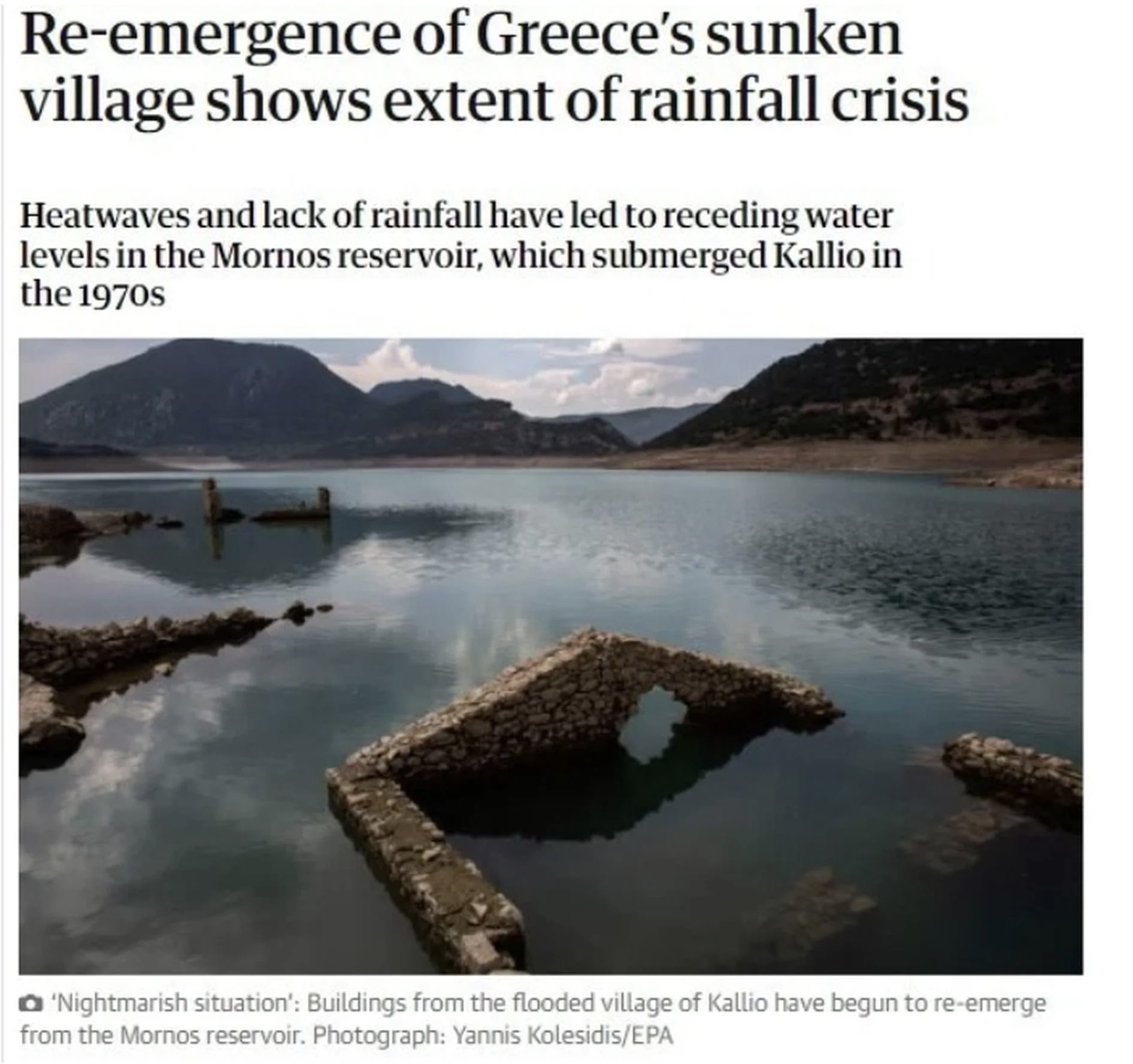 «Η Ελλάδα μετά τους αλλεπάλληλους καύσωνες και την έλλειψη βροχοπτώσεων περνά μία κλιματική κρίση», γράφει το βρετανικό μέσο ενημέρωσης και κάνει ιδιαίτερη αναφορά στον Μόρνο ο οποίος έχει στερέψει με αποτέλεσμα να αρχίζουν να εμφανίζονται μετά από 50 χρόνια τα σπίτια του βυθισμένου χωριού Κάλλιο.