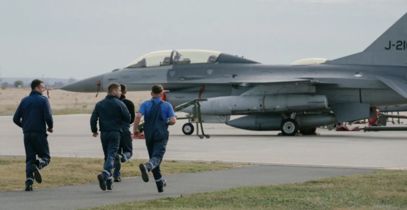 Στρατιώτες και ειδικοί τρέχουν στον διάδρομο της βάσης Fetești προς ένα αεροπλάνο F-16. Στη βάση αυτή εγκαινιάστηκε κέντρο εκπαίδευσης πιλότων F-16, συμπεριλαμβανομένων των Ουκρανών