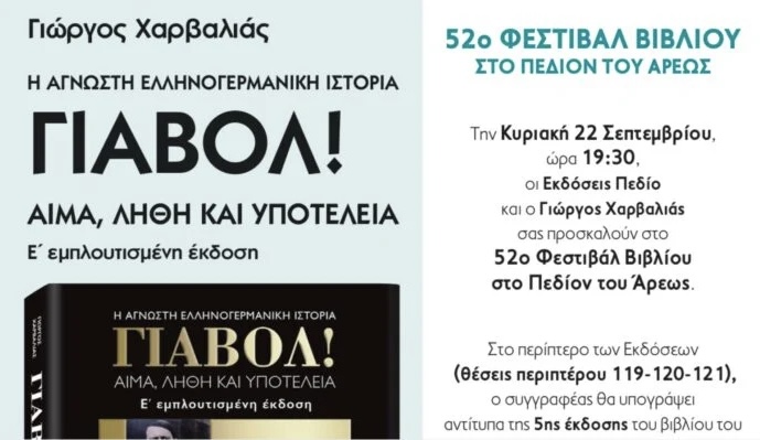 Την Κυριακή 22 Σεπτεμβρίου στις 19.30 το απόγευμα, στο περίπτερο των Εκδόσεων (θέσεις περιπτέρου 119-120-121), ο συγγραφέας του «Γιαβόλ! Αίμα, λήθη και υποτέλεια» θα υπογράψει αντίτυπα της 5ης έκδοσης του βιβλίου του και θα συνομιλήσει με τους αναγνώστες.