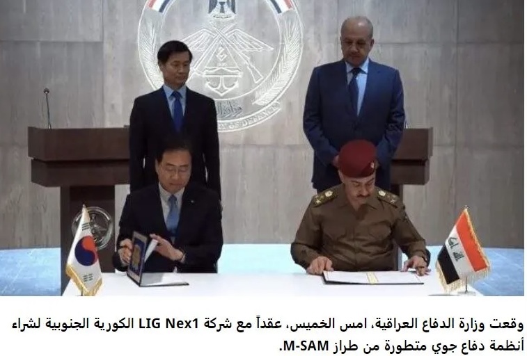 Το Υπουργείο Άμυνας του Ιράκ υπέγραψε την Πέμπτη, σύμβαση με τη νοτιοκορεατική εταιρεία LIG Nex1 για την αγορά προηγμένων συστημάτων αεράμυνας M-SAM.