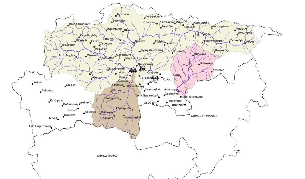 Εικόνα 1. Η απεικόνιση, της «λεκάνης απορροής» (επιφάνεια με «ανοιχτή πράσινη» απόχρωση) (του «”Πηνειού Ποταμού”, που αντιστοιχεί έως την θέση στην «Γέφυρα Διάβας», η οποία βρίσκεται περίπου στην θέση ανάμεσα στον οικισμό «Διάβα» και στην πόλη «Καλαμπάκα»), ηαπεικόνιση, της «λεκάνης απορροής» (επιφάνεια με «ανοιχτή καφέ» απόχρωση) (του «”Πηνειού Ποταμού” και συγκεκριμένα του «Κλεινοβίτικου Ρέματος», που αντιστοιχεί έως την θέση στην «Γέφυρα Αμπελίων», η οποία βρίσκεται περίπου στην θέση μεταξύ των οικισμών «Αμπέλια», «Μπάσια» και «Μουργκάνη»), των «υδρογραφικών(γραμμικών) δικτύων» (γραμμές με «έντονη μπλε» απόχρωση με διαβάθμιση του πάχους της γραμμής, όπου το πάχος της κάθε γραμμής εξαρτάται από την “τάξη” του εκάστοτε ρέματος που αντιπροσωπεύει δηλαδή όσο μεγαλύτερη είναι η “τάξη” του ρέματος τόσο παχύτερη είναι και η αντίστοιχη γραμμή που το αντιπροσωπεύει), η απεικόνιση, της «λεκάνης απορροής» (επιφάνεια με «ανοιχτή ροζ» απόχρωση) (του «”Πηνειού Ποταμού” και συγκεκριμένα του «Ρέματος Πότοκας», πουαντιστοιχεί έως την θέση του οικισμού της «Θεόπετρας», των «υδρογραφικών (γραμμικών) δικτύων» (γραμμές με «έντονη μπλε» απόχρωση με διαβάθμιση του πάχους της γραμμής, όπου το πάχος της κάθε γραμμής εξαρτάται από την “τάξη” του εκάστοτε ρέματος που αντιπροσωπεύει δηλαδή όσο μεγαλύτερη είναι η “τάξη” του ρέματος τόσο παχύτερη είναι και η αντίστοιχη γραμμή που το αντιπροσωπεύει),των «οικισμών του Δήμου Μετεώρων» (κουκίδες με «μαύρη» απόχρωση και ονομασία, επίσης, με «μαύρη» απόχρωση), του «περιγράμματος του “Δήμου Μετεώρων”» (γραμμή με «μαύρη»απόχρωση) και η προτεινόμενη θέση ενός «νέου φράγματος, (σχετικό εικονίδιο)», «του οποίου η ενδεχόμενη κατασκευή θα μείωνε την υδραυλική πίεση» στην «Γέφυρα Διάβας» κατά περίπου «95%» όπως απεικονίζονται στο «ελεύθερο διαδικτυακά λογισμικό» «Q.G.I.S.» [4],μέσω των σχετικών αρχείων που ανακτήθηκαν τόσο από την σχετικήδιαδικτυακή «πλατφόρμα» («Copernicus») όσο και από την σχετική διαδικτυακή «πλατφόρμα» («ΕΛ.ΣΤΑΤ.»),[1,2,4].