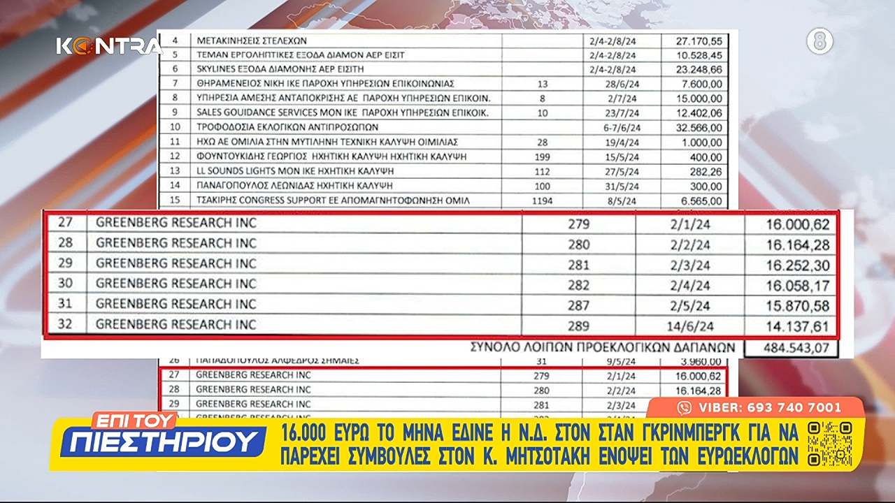 Περίπου 100.000 ευρώ το εξάμηνο κόστισαν οι υπηρεσίες του Σταν Γκρίνμπεργκ στη Νέα Δημοκρατία, η οποία για πρώτη φορά δημοσίευσε τιμολόγια με τις απολαβές του Αμερικανού συμβούλου του Κυριάκου Μητσοτάκη.