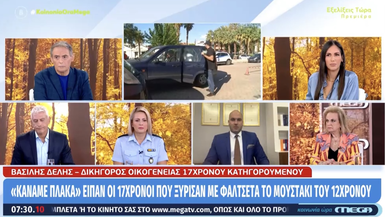 «Ο πελάτης μου επισήμανε από την αρχή ότι όλα συνέβησαν στο πλαίσιο ενός αστεϊσμού, ο οποίος ενδεχομένως ξέφυγε των προβλεπόμενων ορίων, όπως έχει γίνει ξανά στο παρελθόν σε τέτοιου είδους ηλικίες λόγω της ανωριμότητας. Δεν επιθυμούσε να τρομάξει κανέναν και η φαλτσέτα, τη μέρα που έλαβε χώρα το συμβάν, ευρέθη συμπωματικά στα πράγματά του και από παραίνεση άλλου συμμαθητή, έπαιξαν το ‘παιχνίδι του κουρείου’» δήλωσε ο κ. Βασίλης Δελής στο MEGA.