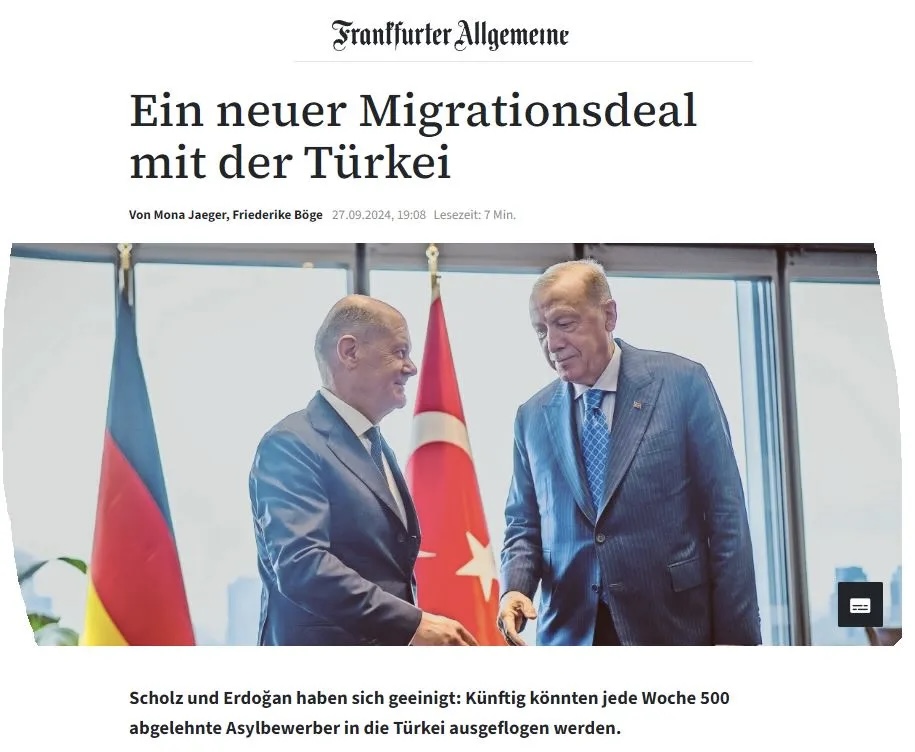 Σύμφωνα με την εφημερίδα Frankfurter Allgemeine Zeitung , ο Γερμανός καγκελάριος Όλαφ Σολτς και ο Τούρκος πρόεδρος Ρετζέπ Ταγίπ Ερντογάν συμφώνησαν να ξεκινήσουν τη μαζική απέλαση Τούρκων πολιτών από τη Γερμανία.