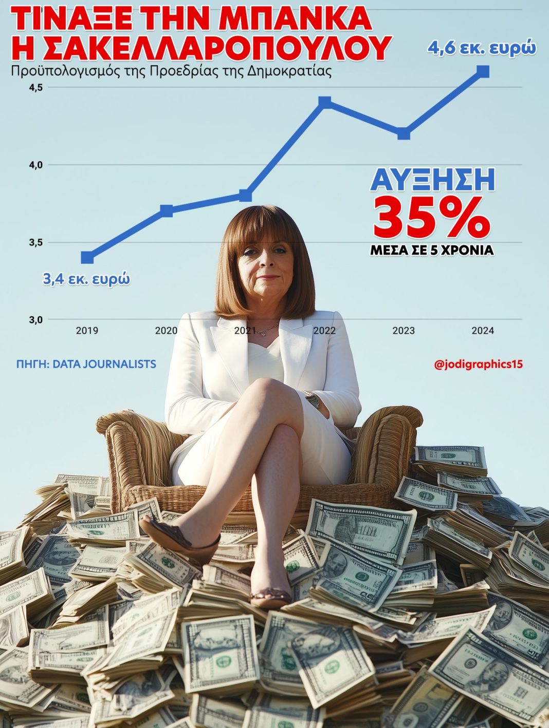Συγκεκριμένα, το 2019 ο προϋπολογισμός της Προεδρίας ανερχόταν στα 3,4 εκατ. ευρώ, στα ίδια ακριβώς επίπεδα με αυτά του 2018. Από το 2020, που ανέλαβε η κ. Σακελλαροπούλου, οι δαπάνες αυξάνονταν σχεδόν κάθε χρόνο, με συνέπεια να φτάσουν για το 2024 στα 4,6 εκατ. (+35%).