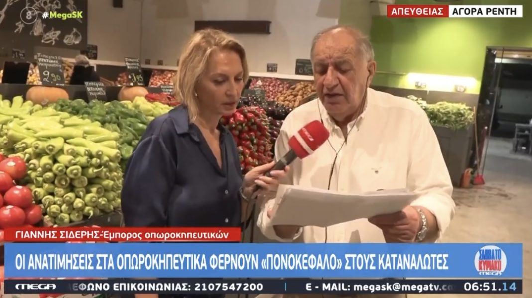 Ο Ιωάννης Σιδέρης, έμπορος οπωροκηπευτικών, μίλησε νωρίτερα σήμερα το πρωί σε τηλεοπτική εκπομπή σχετικά με τις τιμές των προϊόντων και τους λόγους που οδήγησαν σε αυτήν την κατάσταση, ενώ παράλληλα εξέφρασε τον φόβο του για περαιτέρω αυξήσεις μέσα στους επόμενους μήνες.