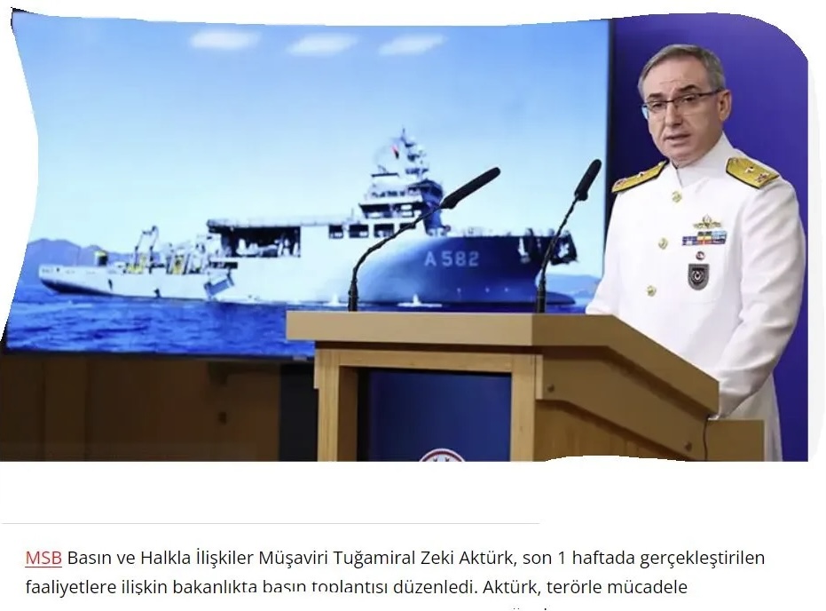 «Ο Σύμβουλος Τύπου και Δημοσίων Σχέσεων του Υπουργείου Άμυνας Αντιναύαρχος Ζέκι Ακτούρκ παραχώρησε συνέντευξη Τύπου στο υπουργείο σχετικά με τις δραστηριότητες που πραγματοποιήθηκαν την τελευταία εβδομάδα», γράφει το τουρκικό δημοσίευμα.