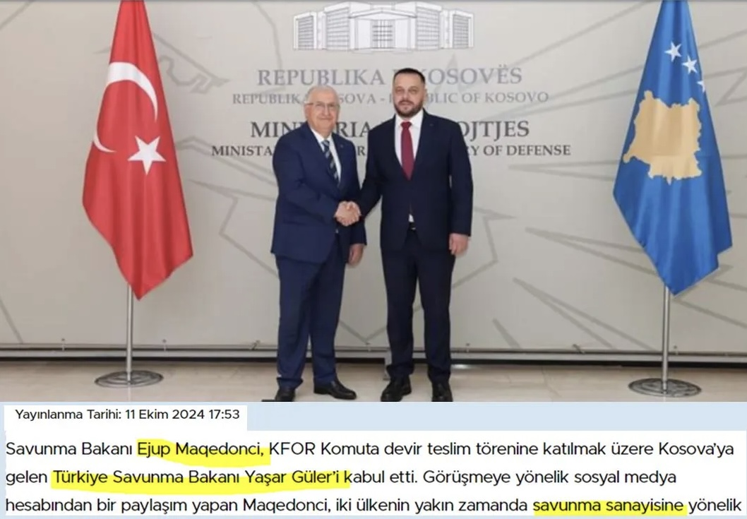 Ο υπουργός Άμυνας του Κοσσυφοπεδίου, Εγιούπ Μακεντόντσι, δέχθηκε σήμερα τον Τούρκο υπουργό Άμυνας Γιασάρ Γκιουλέρ, ο οποίος ήρθε στο Κοσσυφοπέδιο για να παραστεί στην τελετή παράδοσης της Διοίκησης της KFOR.