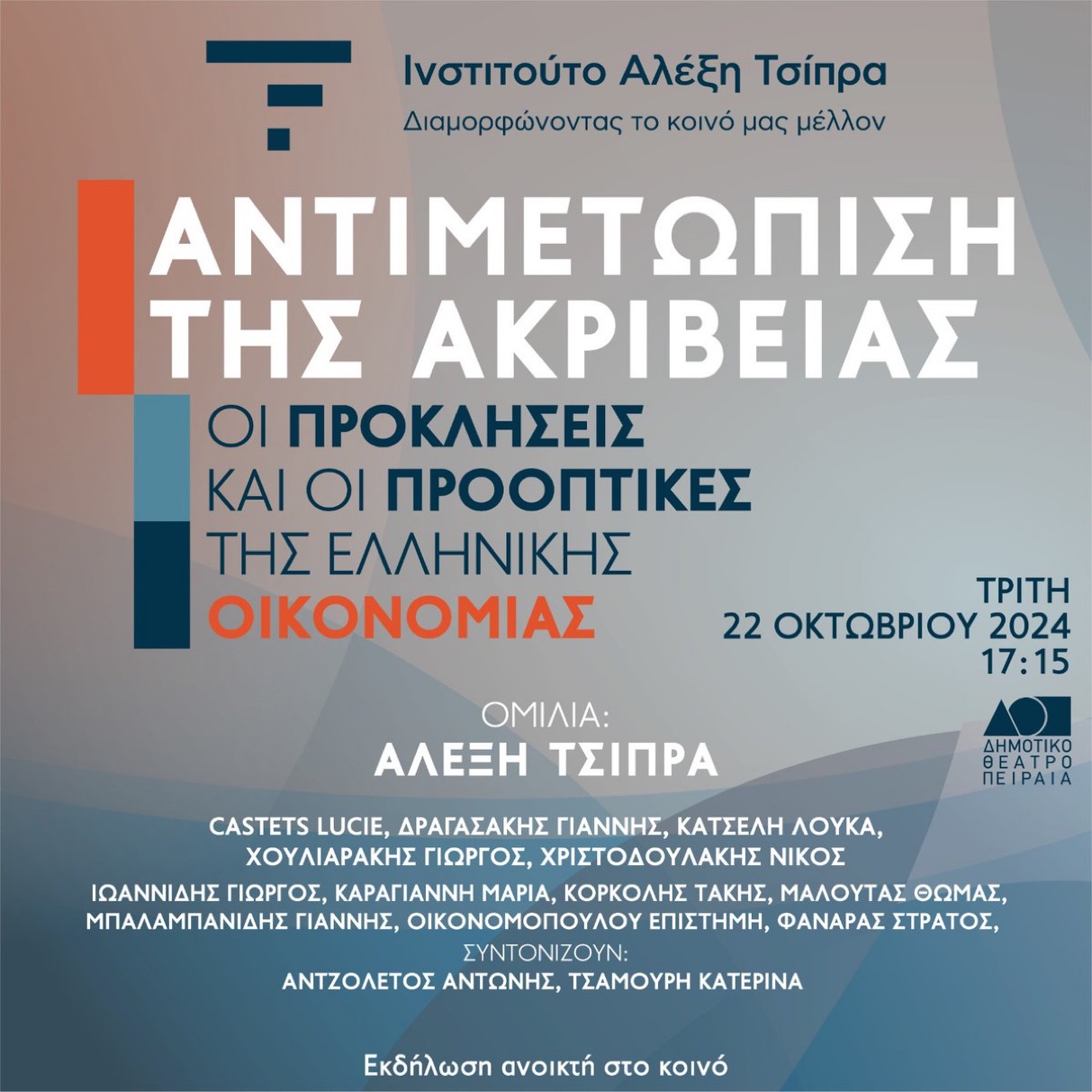 «Η αντιμετώπιση της ακρίβειας, οι προκλήσεις και οι προοπτικές της ελληνικής οικονομίας» – Εκδήλωση του Ινστιτούτου Αλέξη Τσίπρα Τρίτη 22 Οκτωβρίου στο Δημοτικό Θέατρο Πειραιά