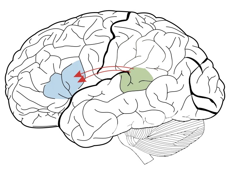* Εικόνα: φλοιώδεις περιοχές στο αριστερό ημισφαίριο που σχετίζονται με την κατανόηση ή παραγωγή του λόγου. Με μπλε χρώμα απεικονίζεται η περιοχή Broca, με πράσινο η περιοχή Wernicke.