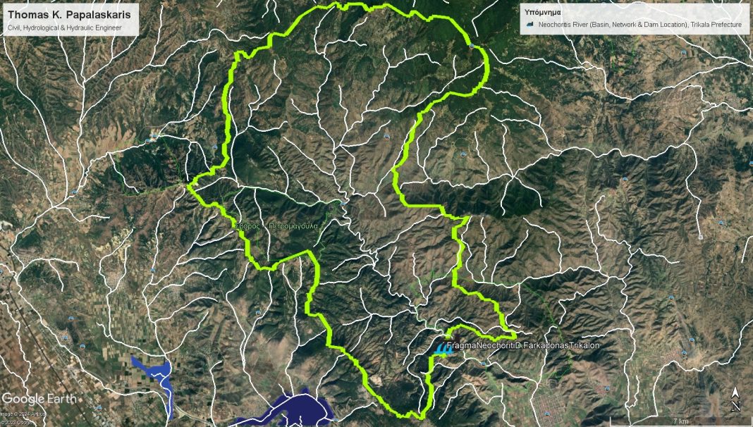 Εικόνα 3. Η απεικόνιση της λεκάνης απορροής (περίγραμμα επιφάνειας με «ανοιχτή πράσινη» απόχρωση), που αντιστοιχεί έως την θέση όπου σχεδιάστηκε, αρχικά, να κατασκευαστεί το «Φράγμα Ποταμού Νεοχωρίτη, Δήμου Φαρκαδόνας, Π.Ε. (“Νομού”) Τρικάλων», του αντίστοιχου, περιεχόμενου σε αυτήν, υδρογραφικού δικτύου (γραμμές με «ανοιχτήάσπρη» απόχρωση) και της, αρχικά σχεδιασθείσας, θέσης του, «Φράγματος Νεοχωρίτη Ποταμού», («σχετικό, συμβολικό, εικονίδιο απεικόνισης φράγματος», επί του υπόβαθρου της διαδικτυακής πλατφόρμας «Google Earth» [1,2,4,9].