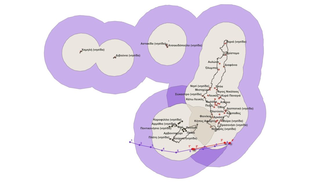 Εικόνα 1. Η απεικόνιση της θεωρητικής πορείας του ιταλικού ερευνητικού πλοίου «IEVOLI RELUME» σύμφωνα με την πρώτη/πρωταρχική,ελληνική, «NAVTEX No:693/2024 (17-20/07/2024)» (κουκίδες με «γαλάζια απόχρωση» και συνακόλουθη γραμμή με «γαλάζια απόχρωση» αριθμημένη, με τους αριθμούς της αντίστοιχης σχετικής προαναφερθείσας «NAVTEX», σαν «1-2-…-8-9») και η απεικόνιση της θεωρητικής πορείας του ιταλικού ερευνητικού πλοίου «IEVOLIRELUME» σύμφωνα με την νέα, δεύτερη και τελευταία, ελληνική,«NAVTEX No:718/2024 (23-24/07/2024)» (αστερίσκοι με «κόκκινηαπόχρωση» και συνακόλουθη γραμμή με «κόκκινη απόχρωση»αριθμημένη, με τους αριθμούς της αντίστοιχης σχετικής προαναφερθείσας «NAVTEX», σαν «1’-2’–3’–4’»), των «οικισμών του Δήμου Κάσου» και των «οικισμών του Δήμου Καρπάθου» (κουκίδες με «μαύρηαπόχρωση» και ονομασία, επίσης, με «μαύρη απόχρωση»), του «περιγράμματος του “Δήμου Κάσου”» και του «περιγράμματος του “Δήμου Καρπάθου”» (γραμμή με «μαύρη απόχρωση»), η περιοχή των «6,00 (έξι) ναυτικών μιλίων», (περιοχή με «καφέ ανοιχτή απόχρωση» όπου η περιοχή με «ελαφρά σκούρα καφέ απόχρωση» αναπαριστά την κοινή / συμπίπτουσα / συγχωνευμένη περιοχή των “6,00 (έξι) ναυτικών μιλίων” των «Δήμου Κάσου» και «Δήμου Καρπάθου»), γύρω από το σύμπλεγμα των «Δήμου Κάσου» και «Δήμου Καρπάθου» καθώς επίσης και η κοινή / συμπίπτουσα / συγχωνευμένη περιοχή των «12,00 (δώδεκα) ναυτικών μιλίων», (το άθροισμα της περιοχής με «καφέ ανοιχτή απόχρωση» και της περιοχής με «ελαφρά γαλάζια απόχρωση») όπου το άθροισμα των δύο περιοχών αναπαριστά την κοινή/συμπίπτουσα περιοχήτων “12,00 (δώδεκα) ναυτικών μιλίων” των «Δήμου Κάσου» και «Δήμου Καρπάθου»), γύρω από το σύμπλεγμα των «Δήμου Κάσου» και «Δήμου Καρπάθου» ενώ οι «δακτύλιοι» με την «ελαφρά γαλάζιααπόχρωση» απεικονίζουν, ουσιαστικά, την κοινή / συμπίπτουσα /συγχωνευμένη περιοχή μεταξύ των “6,00 (έξι) ναυτικών μιλίων” και των «12,00 (δώδεκα) ναυτικών μιλίων» των «Δήμου Κάσου» και «Δήμου Καρπάθου», γύρω από το σύμπλεγμα των «Δήμου Κάσου» και «Δήμου Καρπάθου» και οι οποίες απεικονίσεις επιτεύχθηκαν με την χρήση του αλγόριθμου με την ονομασία «Buffer» του λογισμικού «Q.G.I.S.»), όπως απεικονίζονται στο «ελεύθερο διαδικτυακά λογισμικό» «Q.G.I.S.» [3],μέσω και των σχετικών αρχείων που ανακτήθηκαν από την σχετική διαδικτυακή «πλατφόρμα» («ΕΛ.ΣΤΑΤ.»),[1,2,3.1-3.6,6.1-6.4].