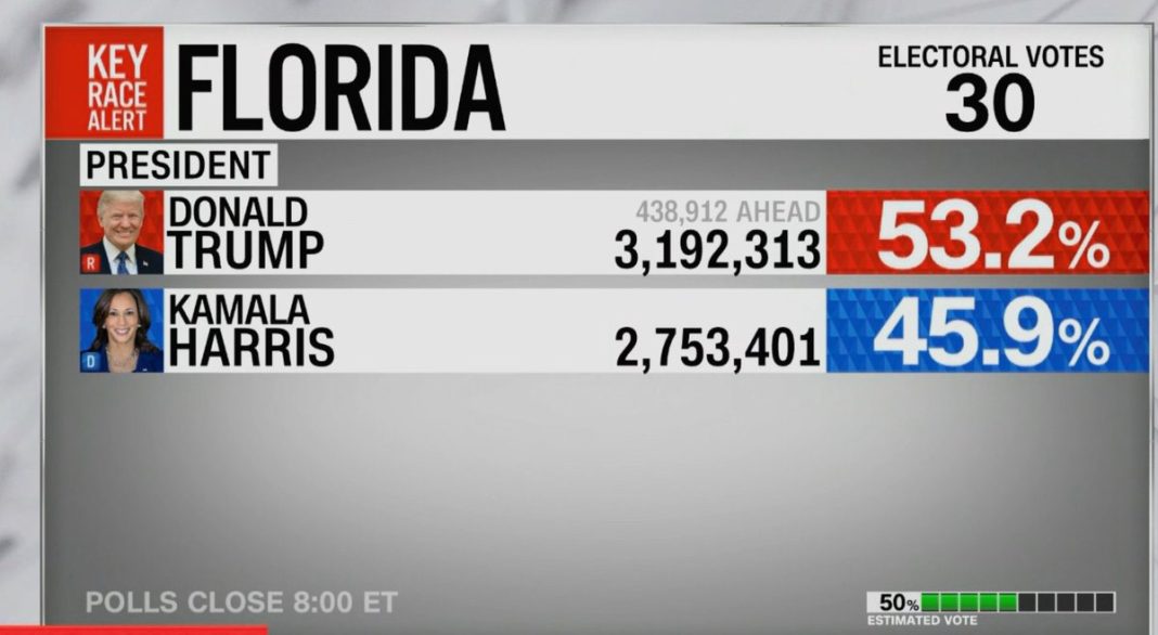 Ο Τραμπ επικρατεί απόλυτα της Καμάλα Χάρις στη Φλόριντα με καταμετρημένο το 50% των ψήφων.