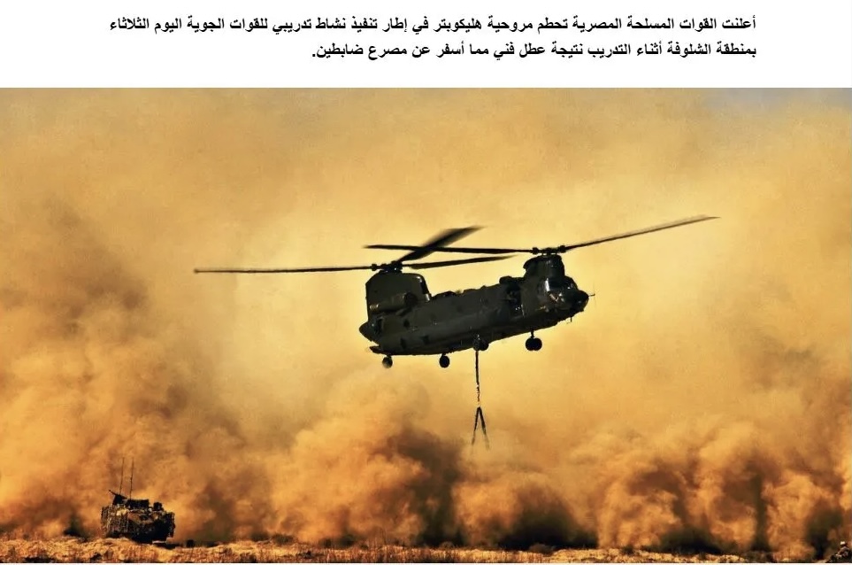 Οι Αιγυπτιακές Ένοπλες Δυνάμεις ανακοίνωσαν ότι ελικόπτερο του Στρατού συνετρίβη στο πλαίσιο εκπαιδευτικής δραστηριότητας της Πολεμικής Αεροπορίας την Τρίτη στην περιοχή Σαλούφα κατά τη διάρκεια εκπαίδευσης ως αποτέλεσμα τεχνικής δυσλειτουργίας, με αποτέλεσμα τον θάνατο δύο αξιωματικών.