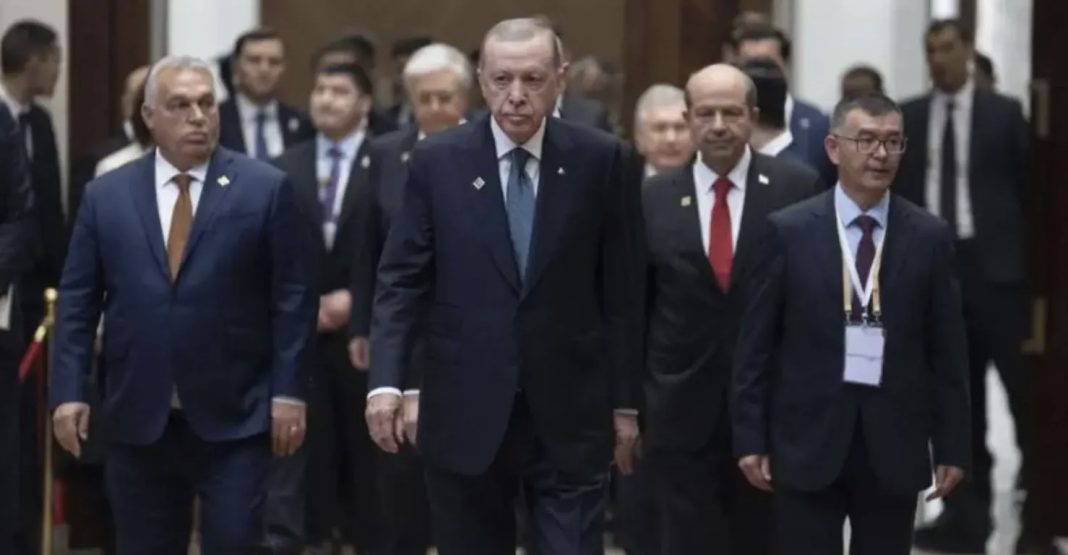 Φωτό: Ο Ούγγρος πρωθυπουργός Βίκτορ Όρμπαν (αριστερά), ο Ρετζέπ Ταγίπ Ερντογάν και ο Πρόεδρος των Τουρκοκυπρίων Ερσίν Τατάρ (δεξιά) στη σύνοδο κορυφής που πραγματοποιήθηκε στο Μπισκέκ στις 6 Νοεμβρίου.