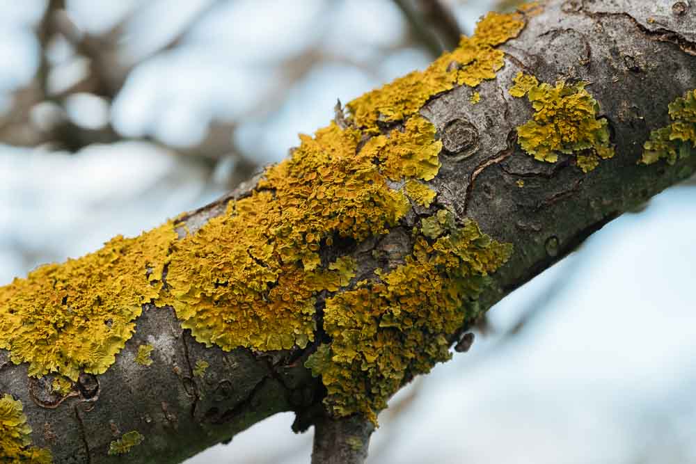 Οι λειχήνες καλύπτουν με ένα χαρακτηριστικό κιτρινοπράσινο χρώμα τους κορμούς και τα κλαδιά των καρποφόρων δέντρων και θάμνων.