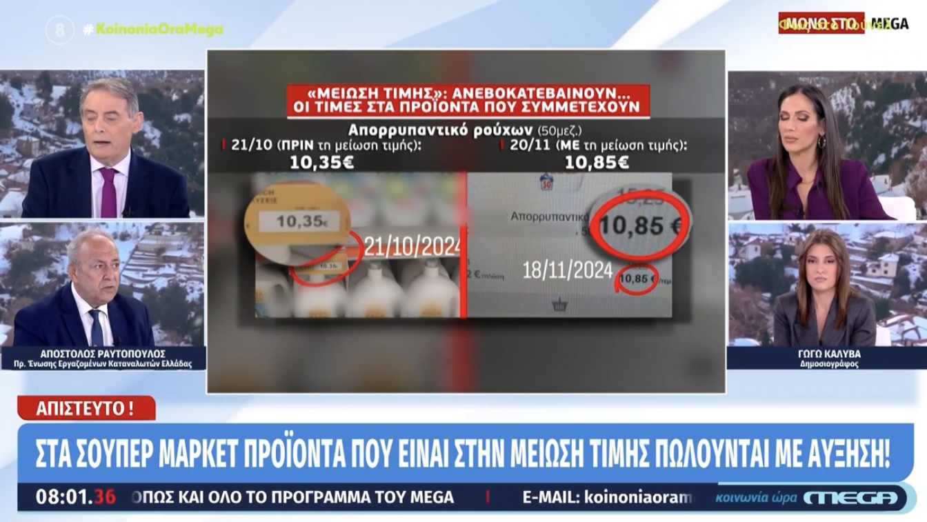 Ειδικότερα, όπως αναφέρει σε σημερινό ρεπορτάζ η εκπομπή «Κοινωνία Ώρα MEGA», υπάρχουν προϊόντα που -υποτίθεται ότι- εντάχθηκαν στην πρωτοβουλία «μείωση τιμής», τα οποία πωλούνται από τα σούπερ μάρκετ με… αυξημένη τιμή! «Κοροϊδία μπροστά στα μάτια μας. Όταν ενημερώνουμε τον κόσμο για τη νέα πρωτοβουλία… στην ουσία η είδηση που μεταφέρουμε δεν είναι αληθινή. Πραγματικά αισθάνομαι άσχημα. Είναι κάτι που μας πασάρουνε και αν δεν το ψάξουμε, θα το φάμε αμάσητο», ανέφερε αγανακτισμένη η Ανθή Βούλγαρη.