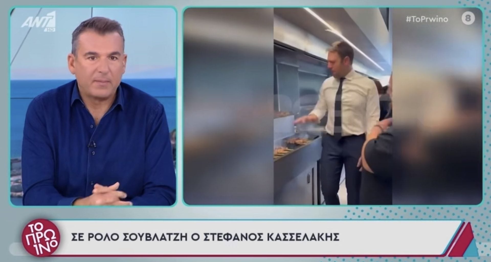 Το βιντεο το είδαμε στο διαδίκτυο και ειναι απο την εκπομπή του Γιώργου Λιάγκα. Οπως λέει ο παρουσιαστής ο Στεφανος Κασσελακης μπήκε σε ψητοπωλείο στη Λιβαδειά και έψησε σουβλακια για λίγα δευτερόλεπτα μπροστά στην κάμερα.