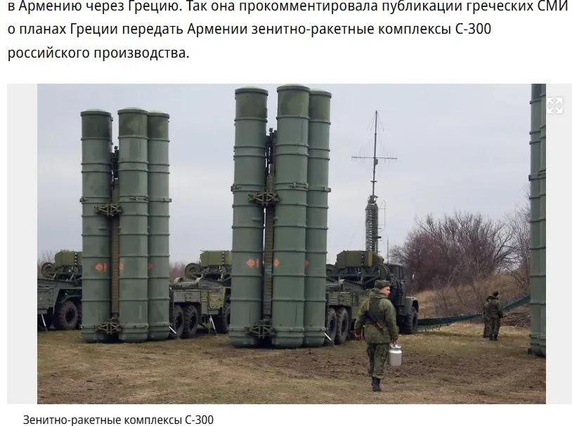 Η Μόσχα δεν έχει λάβει κανένα αίτημα από την Αθήνα για μεταφορά ρωσικών όπλων σε άλλες χώρες, δήλωσε η επίσημη εκπρόσωπος του ρωσικού υπουργείου Εξωτερικών, Μαρία Ζαχάροβα, σχολιάζοντας δημοσιεύματα των ελληνικών ΜΜΕ ότι η ελληνική κυβέρνηση ετοιμάζεται να μεταφέρει τους ρωσικούς S-300/(C-300) από το οπλοστάσιό της προς την Αρμενία, γράφει σήμερα η ρωσική Kommersant.