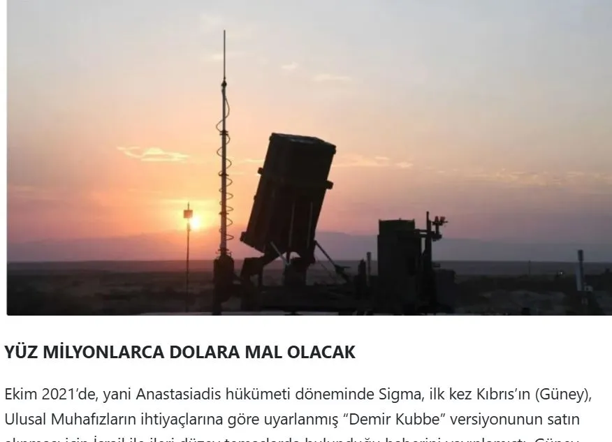 Σύμφωνα με τις ειδήσεις της τηλεόρασης Sigma, ο «Σιδερένιος Θόλος» παραγωγής Ισραήλ μεταφέρθηκε στην Κυπριακή Δημοκρατία, δημοσιεύει η τουρκική Sözcü.