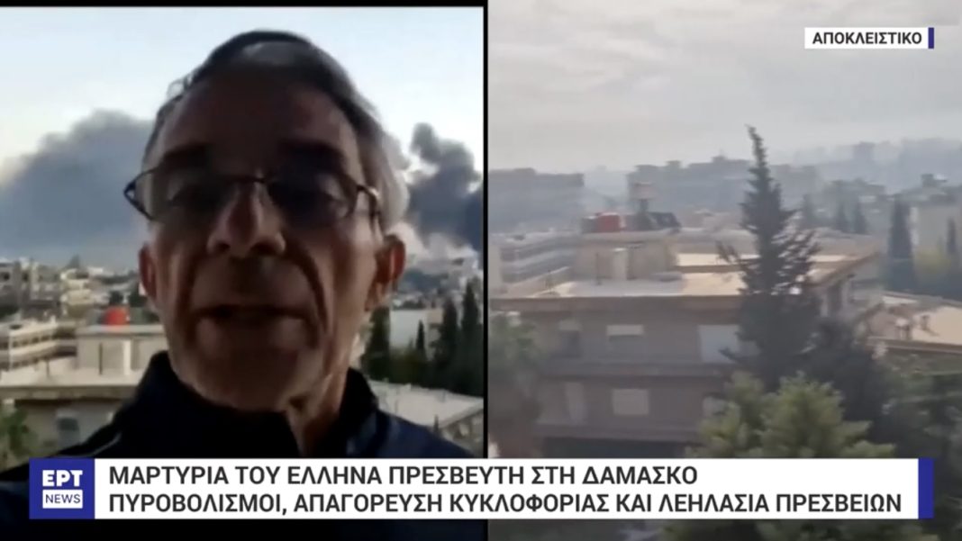«Έχουμε τώρα απαγόρευση κυκλοφορίας, αλλά υπάρχουν πυροβολισμοί. Οι ελληνικές οικογένειες εδώ αριθμώνται στις περίπου 50 – 60. Έχω μιλήσει με τον Πρόεδρο και με μέλη των Ελλήνων της ελληνικής ομογένειας. Μέχρι στιγμής η σύσταση η δική μου, της πρεσβείας δηλαδή, ήταν να μείνουν στα σπίτια τους. Η κατάληψη της Δαμασκού από τους αντάρτες έγινε στις 4 με 5 η ώρα το πρωί. Από τότε δεν έχουν σταματήσει οι πυροβολισμοί.