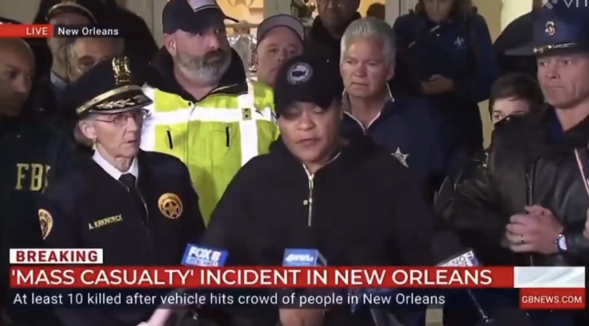 Τουλάχιστον 12 άνθρωποι νεκροί και άλλοι 35 τραυματίστηκαν όταν ένας άνδρας έριξε το αυτοκίνητο μέσα σε πλήθος στη Νέα Ορλεάνη. Πληροφορίες κάνουν λόγο για ύπαρξη εκρηκτικού μηχανισμού στο τζιπ, το οποίο φέρει μία μαύρη σημαία που ακόμα δεν έχει διακριβωθεί τι συμβολίζει.