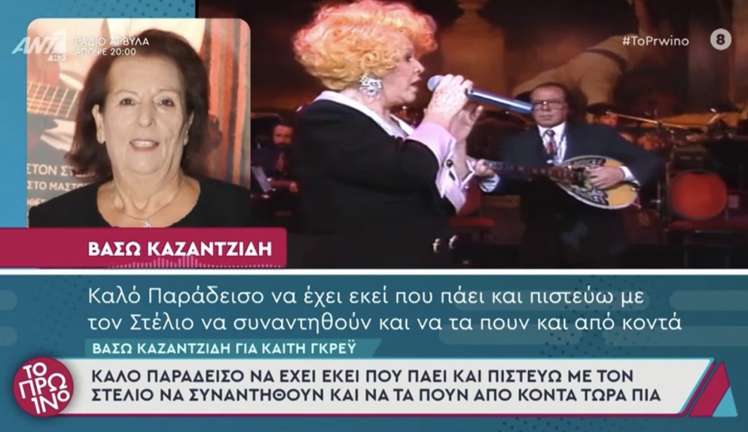 «Καλό παράδεισο να έχει εκεί που πάει, και πιστεύω ότι με τον Στέλιο να συναντηθούν και να τα πούνε από κοντά, τώρα πια…», ανέφερε στην εκπομπή «Πρωινό» και πρόσθεσε: «Ήταν αρκετά χρόνια μαζί (σ.σ με τον Στέλιο Καζαντζίδη), ήταν μαζί, ήταν σύντροφοι».