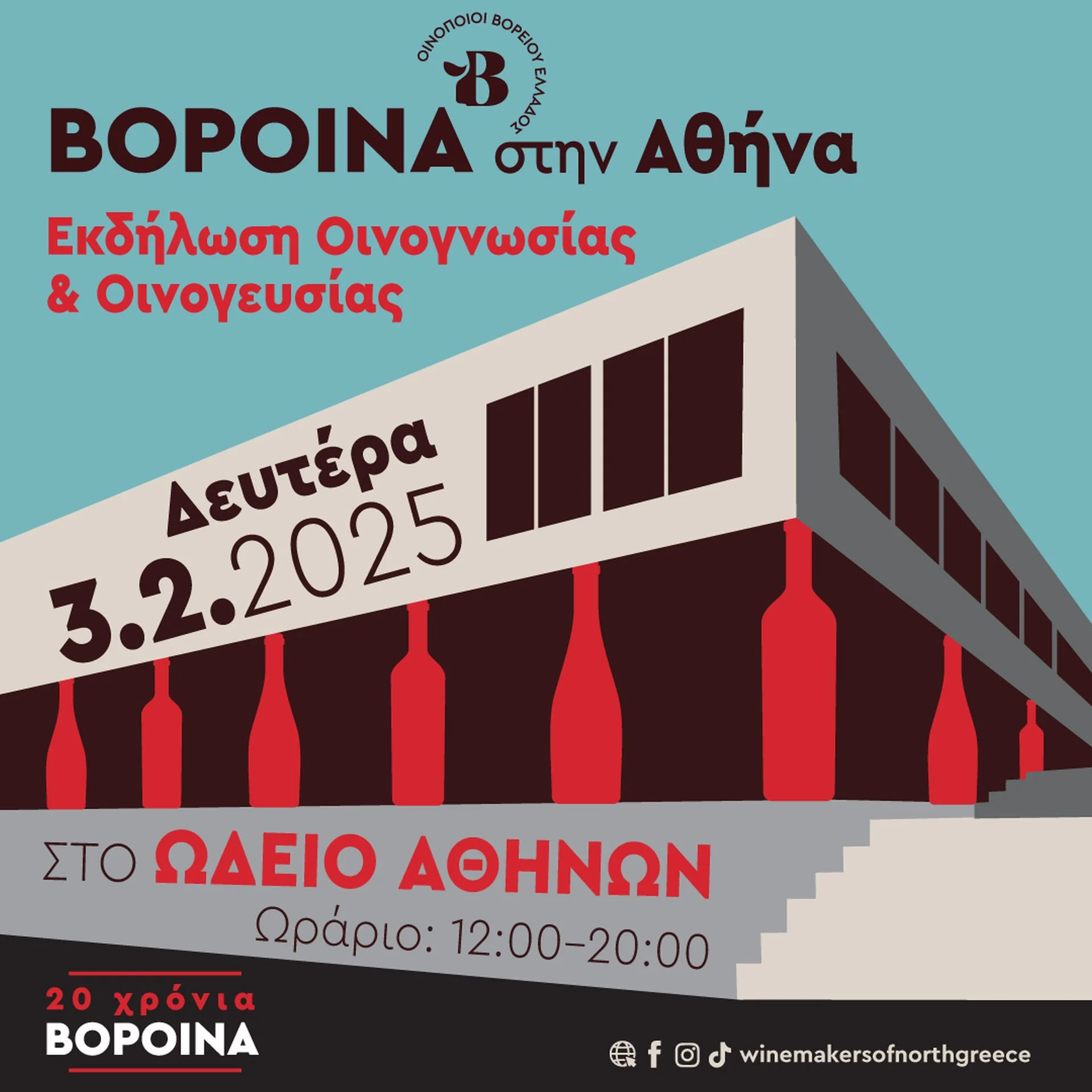 Τα «ΒορΟινά», η μεγάλη εκδήλωση παρουσίασης και γευσιγνωσίας οίνων και αποσταγμάτων των «Οινοποιών Βορείου Ελλάδος» γιορτάζει τα 20 χρόνια της και έρχεται στην Αθήνα στο ετήσιο ραντεβού της με το αθηναϊκό -και όχι μόνο- κοινό, τη Δευτέρα 3 Φεβρουαρίου 2025, στο Ωδείο Αθηνών (στο Φουαγιέ Τεχνών) με ωράριο 12:00 έως 20:00.