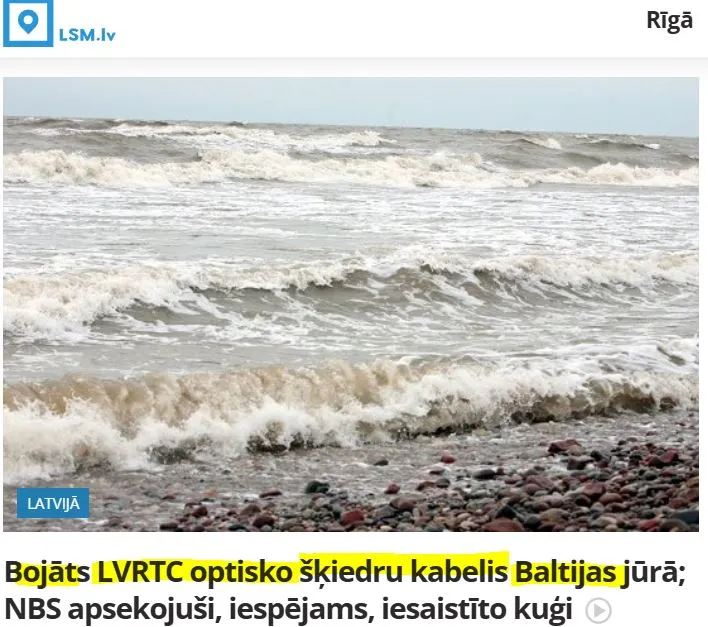 Ένα υποθαλάσσιο καλώδιο οπτικών ινών μεταξύ Λετονίας και Σουηδίας υπέστη ζημιά νωρίς το πρωί της Κυριακής, πιθανότατα ως αποτέλεσμα «εξωτερικών επιρροών», μετέδωσε ο δημόσιος ραδιοτηλεοπτικός σταθμός lsm.lv (της Λετονίας), επικαλούμενος την εταιρεία που κατέχει το καλώδιο.