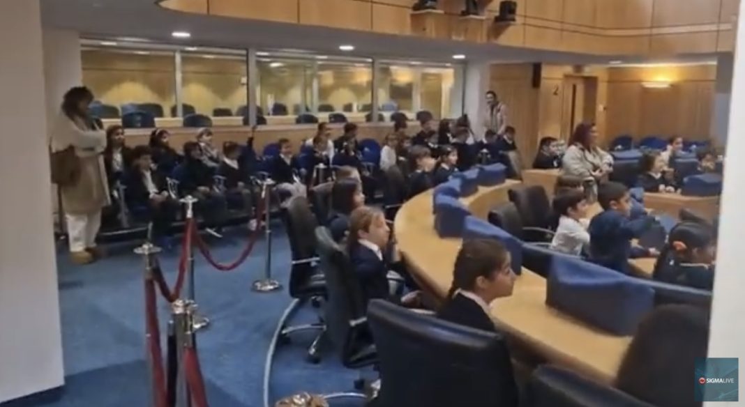 Στα έδρανα της κυπριακής Βουλής (στη μεγάλη αίθουσα συνεδριάσεων της Βουλής των Αντιπροσώπων) έκατσαν την Τετάρτη (29/1) μικροί μαθητές του ΚΑ Δημοτικού Δασούπολης (Β και Γ τάξη) και έκλεψαν την παράσταση και τον θαυμασμό όλων με το παθιασμένο τραγούδι τους για τη λευτεριά της πατρίδας τους.
