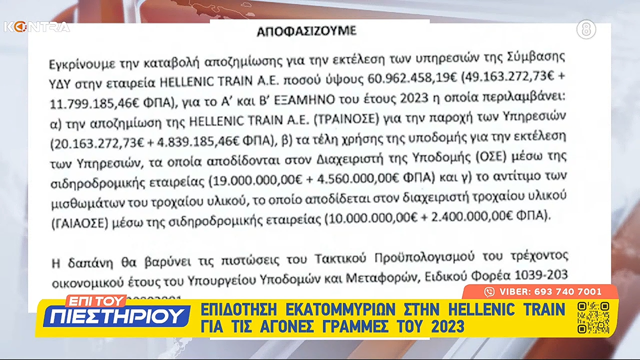 Πιο συγκεκριμένα με απόφαση του υπουργού Μεταφορών Χρ Σταικούρα, της Γενικής Γραμματείας Μεταφορών, της Διεύθυνσης Μεταφορών καταβάλλεται αποζημίωση ύψους 60.962. 45, 19 + ΦΠΑ ευρώ στην Hellenic Train AE για τις υπηρεσίες της σύμβασης ΥΔΥ Α’ και Β΄εξαμήνου του έτους 2023 (τη χρονιά του φονικού δυστυχήματος που στοίχισε τις ζωές σε 57 ανθρώπους)! Η ημερομηνία της απόφασης είναι η 30 . 1. 2025! Δηλαδή πριν από 6 ημέρες την εβδομάδα που ο Πρωθυπουργός έδινε την «περίφημη» συνέντευξη στον Alpha αμέσως μετά την έκρηξη της λαικής οργής της προπερασμένης Κυριακής με μαζικές συγκεντρώσεις διαμαρτυρίας σε 110 πόλεις στην Ελλάδα και 40 στο εξωτερικό για τα Τέμπη και τη συγκάλυψη!