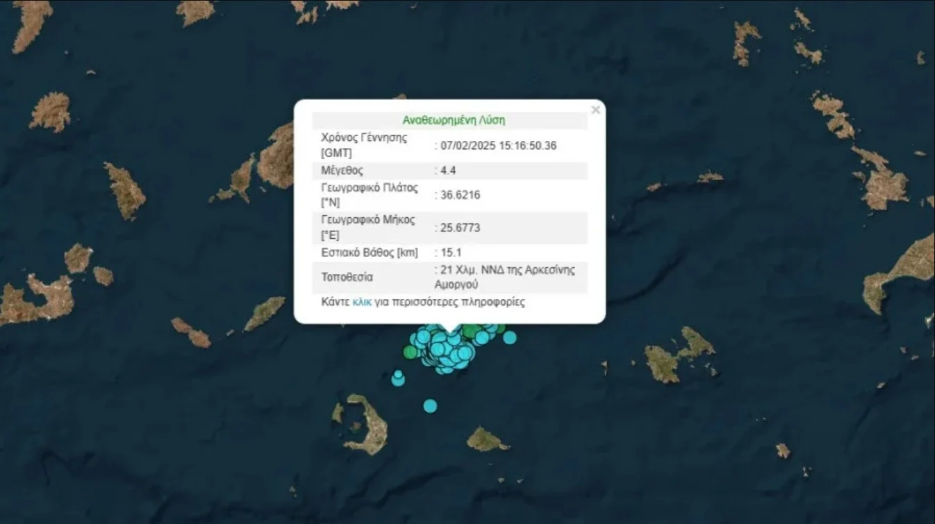 Συνεχίζεται ο χορός του Εγκέλαδου στις Κυκλάδες. Διπλή σεισμική δόνηση μεγέθους 4,4 και 4,5 Ρίχτερ σημειώθηκε το απόγευμα της Παρασκευής στην θαλάσσια περιοχή ανάμεσα σε Σαντορίνη και Αμοργό.