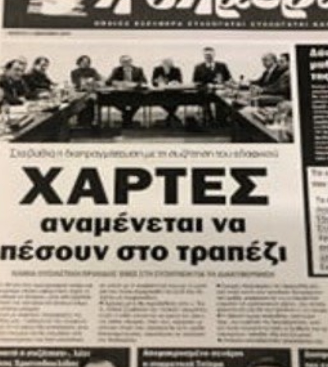 Σημειώνω το πρωτοσέλιδο της «Σημερινής», 11.1.2017, «ΧΑΡΤΕΣ αναμένεται να πέσουν στο τραπέζι… η ε/κ πλευρά έχει ετοιμάσει 14 εναλλακτικούς χάρτες, που ανταποκρίνονται στο 29,2% που προτείνει η τ/κ πλευρά…».