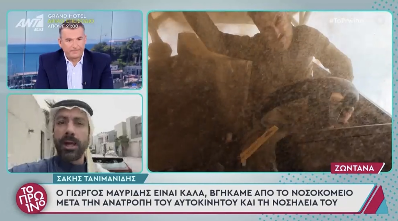 Σε δηλώσεις του στον ΑΝΤ1 ο Σάκης Τανιμανίδης ανέφερε: «Είμαστε και λίγο ανταγωνιστικοί. Πάνω σε αυτό το πάθος του ανταγωνισμού, ο Γιώργος Μαυρίδης πήρε με λίγο μεγαλύτερη ταχύτητα τη στροφή και αναποδογύρισε δύο φορές. Θα μπορούσε να είναι πολύ χειρότερα τα πράγματα. Πήγαμε στο νοσοκομείο για προληπτικούς λόγους. Έχει χτυπήσει το κεφάλι του» περιέγραψε ο Σάκης Τανιμανίδης ο οποίος εμφανίστηκε φορώντας κελεμπία.