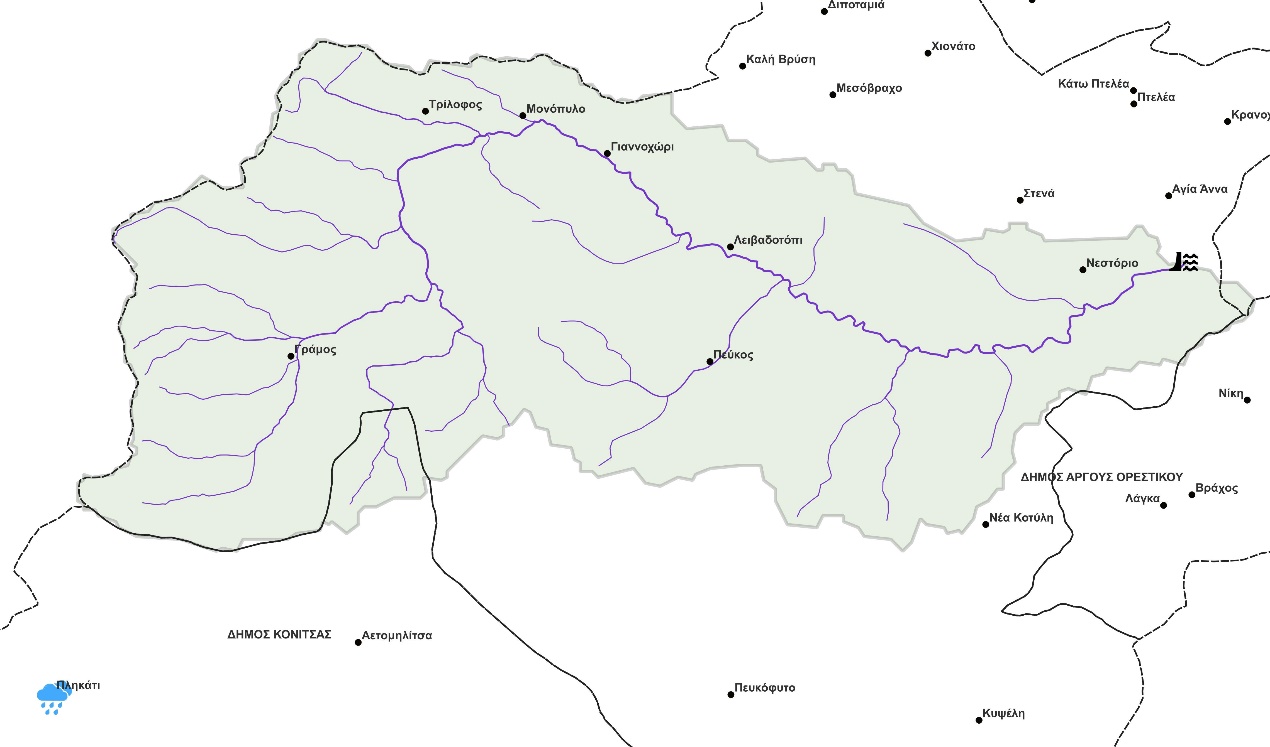 Εικόνα 1. Η απεικόνιση, της «λεκάνης απορροής» (του «“Αλιάκμονα Ποταμού” που αντιστοιχεί έως την θέση στην οποία πρόκειται να κατασκευαστεί το «Φράγμα “Νεστορίου” Ποταμού Αλιάκμονα», του «Δήμου Νεστορίου»), του «υδρογραφικού (γραμμικού) δικτύου» (γραμμές με «έντονη μπλε» απόχρωση), του μετεωρολογικού σταθμού του «Πληκατίου, Δήμου Κόνιτσας» («meteo.gr»), (θεματικό εικονίδιο «σύννεφο με βροχή» με «γαλάζια απόχρωση»), των περιγραμμάτων του «Δήμου Κόνιτσας», του «Δήμου Άργους Ορεστικού» και του «Δήμου Καστοριάς» (διακεκομμένες γραμμές με «μαύρη» απόχρωση)  και των οικισμών του «Δήμου Νεστορίου», του «Δήμου Κόνιτσας», του «Δήμου Άργους Ορεστικού» και του «Δήμου Καστοριάς» (κουκκίδες με «μαύρη» απόχρωση), όπως απεικονίζονται στο «ελεύθερο διαδικτυακά λογισμικό» «Q.G.I.S.» [4], μέσω των σχετικών αρχείων που ανακτήθηκαν τόσο από την σχετική διαδικτυακή «πλατφόρμα» («Copernicus») όσο και από την σχετική διαδικτυακή «πλατφόρμα» («ΕΛ.ΣΤΑΤ.»), [1,2,4].