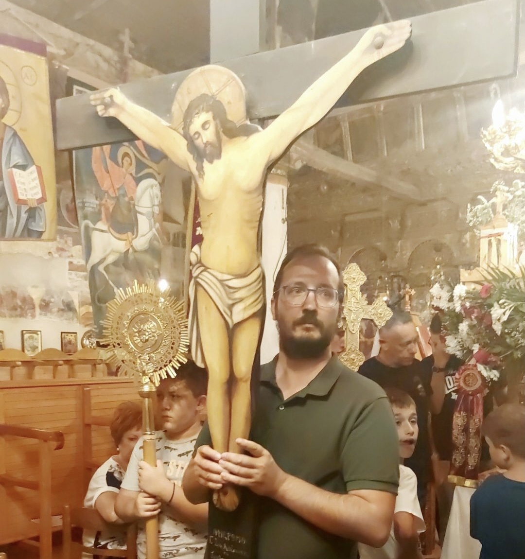 (Στη φωτογραφία ο μακαριστός Βασίλης μου, κρατά με σοβαρότητα και ευλάβεια τον Εσταυρωμένο που του εμπιστεύθηκε ο Ιερέας, για την περιφορά του Επιταφίου της Παναγίας μας, στον ναό του Αη Γιώργη ,στο Περιβόλι Γρεβενών, την 14/8/2024).