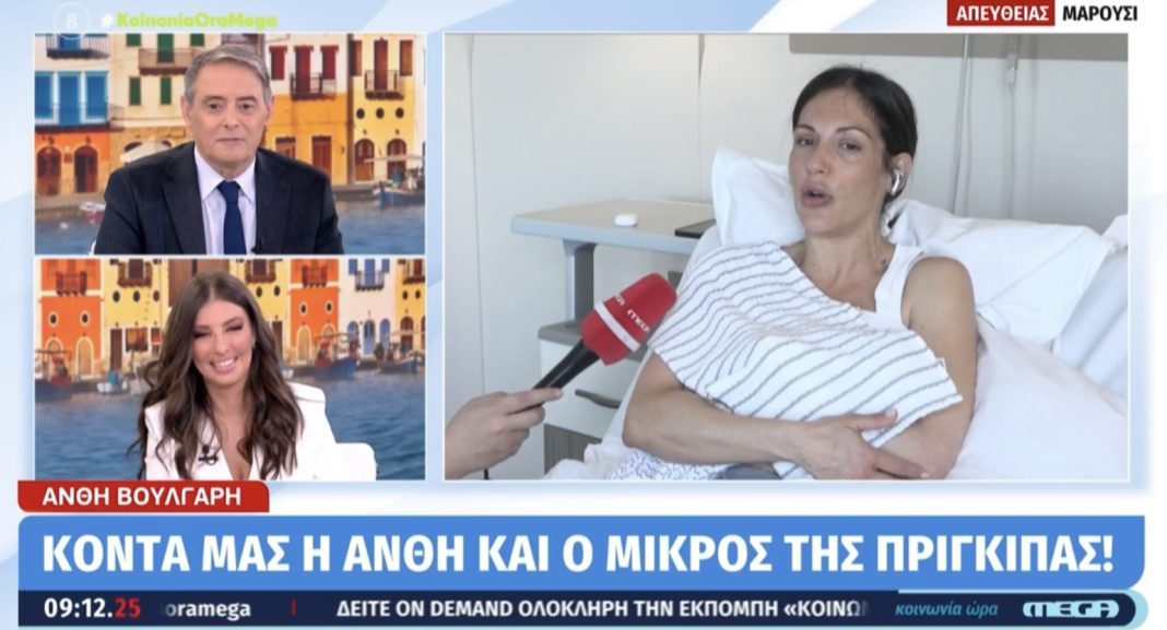 Στον αέρα του Mega βρέθηκε η Ανθή Βούλγαρη σήμερα το πρωί, κρατώντας αγκαλιά τον νεογέννητο γιο της που μάλιστα πείναγε την συγκεκριμένη στιγμή.