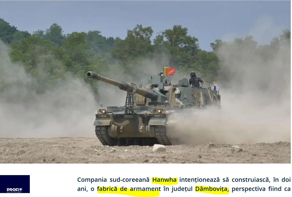 Η νοτιοκορεατική εταιρεία Hanwha σχεδιάζει να κατασκευάσει ένα εργοστάσιο όπλων στην Νταμπόβιτσα της Ρουμανίας. Υπολογίζεται ότι η παραγωγή θα αρχίσει σε δύο χρόνια, γράφει ρουμανικό δημοσίευμα.