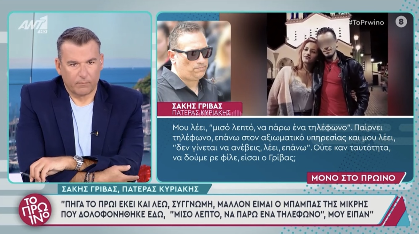 «Το πρωί, το πρωί. Όχι το βράδυ που έγινε το φoνικό,το πρωί που με ειδοποίησε αυτή η κοπελίτσα, η Γαρυφαλλιά, Τριανταφυλλιά Τσούτσου; Εγώ ακόμα δεν το ήξερα. Εγώ πήγα για δουλειά κανονικά, το πιστεύεις; Η κόρη μου πέθανε, 22:20 το βράδυ και εγώ σηκώθηκα, πήρα τυρόπιτα και καφέ και πήγαινα για δουλειά. Φτάνω στη νταλίκα, βάζω μπροστά τη νταλίκα, να την βγάλω έξω, εκείνη την ώρα, με παίρνει τηλέφωνο. Με ρωτάει, “είσαστε ο κύριος Θανάσης Γρίβας;”. Λέω, “ναι”. Λέει, “μια Κυριακή Γρίβα, την γνωρίζετε;”. Λέω, είναι η κόρη μου. Μόλις μου λέει, “έναν … ” τον γνωρίζετε; Της λέω, “τον γνωρίζω. Πες μου ότι δεν είναι το φονικό που διάβασα χθες, στο facebook, το βράδυ, στους Αγίους Αναργύρους. Η κόρη μου είναι ζωντανή;“. Μου λέει, “τι να σου πω…”. Δεν ήθελε η κοπέλα, να μου το πει. Πες μου, το κορίτσι μου είναι ζωντανό ή έχει πεθάνει; Και μου λέει, “έχει πεθάνει”. Και μετά μου λέει, “είμαι εδώ στο τμήμα”. Μου δίνει το τηλέφωνο η κοπέλα να πάρω εκεί στους Αγίους Αναργύρους και παίρνω, δεν μου το σήκωνε καθόλου. Καλούσε, καλούσε, καλούσε, καλούσε, αλλά δεν το σήκωνε κανένας και εγώ έρχομαι προς το τμήμα. Δεν λέω σε κανέναν τίποτα γιατί με το που φτάνω εκεί, βλέπω όλα τα κανάλια απ’ έξω.”.
