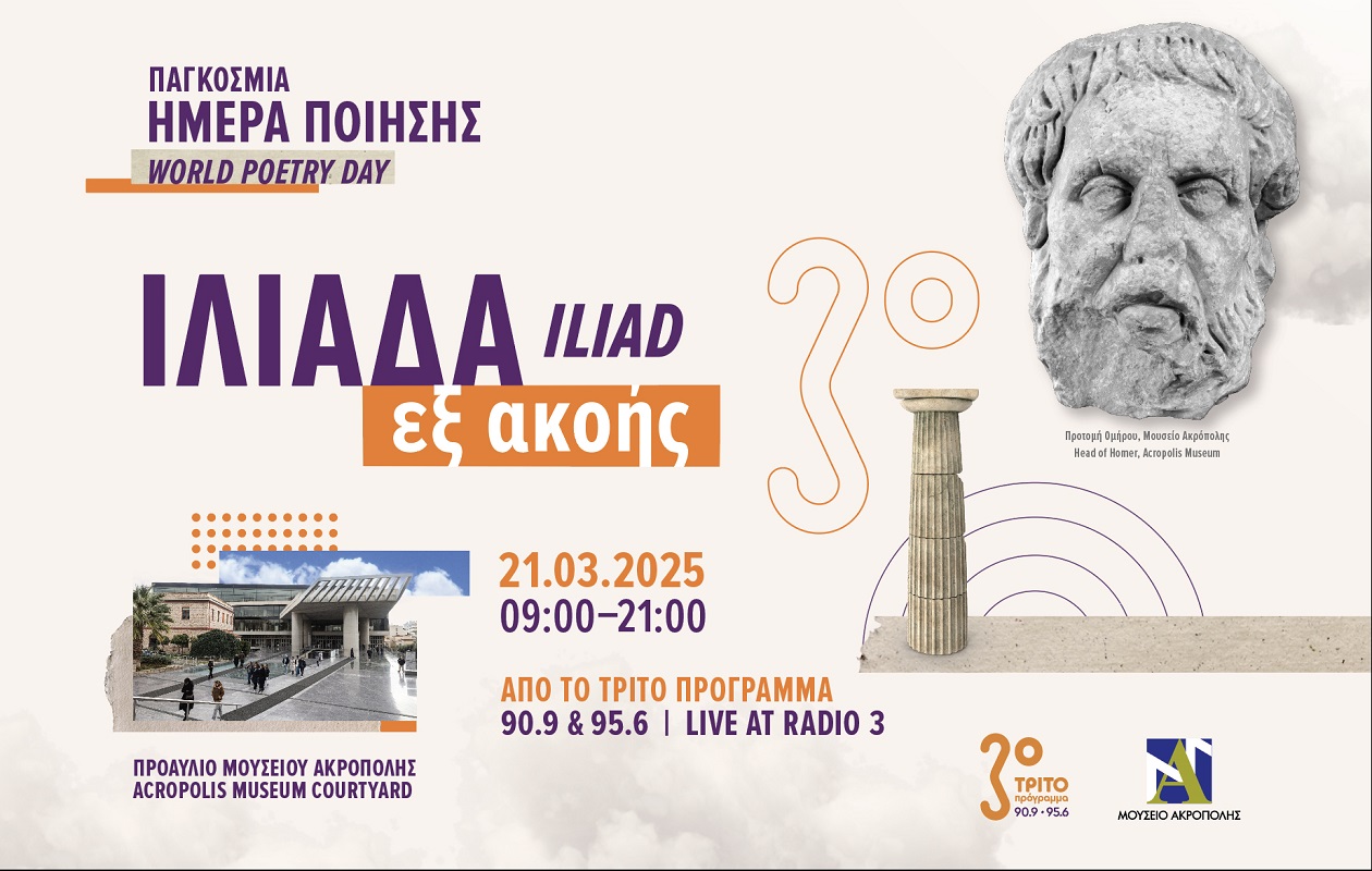 Την Παρασκευή 21 Μαρτίου, Παγκόσμια Ημέρα της Ποίησης, το Τρίτο Πρόγραμμα της ΕΡΤ διοργανώνει μια ξεχωριστή εκδήλωση με τίτλο «Ιλιάδα εξ ακοής», που θα φιλοξενηθεί στο προαύλιο του Μουσείου Ακρόπολης.