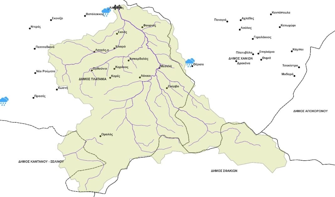 Εικόνα 1. Η απεικόνιση, της «λεκάνης απορροής» (επιφάνεια με «ανοιχτήπράσινη» απόχρωση) (του «”Ποταμού Κερίτη που αντιστοιχεί έως την θέση στην «“Γέφυρα (Τοξωτή) Κερίτη», η οποία βρίσκεται βορειοανατολικά του οικισμού του «Αλικιανού»), του «υδρογραφικού(γραμμικού) δικτύου» (γραμμές με «έντονη μπλε» απόχρωση με διαβάθμιση του πάχους της γραμμής, όπου το πάχος της κάθε γραμμής εξαρτάται από την “τάξη” του εκάστοτε ρέματος που αντιπροσωπεύει δηλαδή όσο μεγαλύτερη είναι η “τάξη” του ρέματος τόσο παχύτερη είναι και η αντίστοιχη γραμμή που το αντιπροσωπεύει), των μετεωρολογικών σταθμών του «Αλικιανού, Χανίων», του «Θερίσου, Χανίων» και του «Σέμπρωνα, Χανίων» (θεματικό εικονίδιο «σύννεφο με βροχή» με «γαλάζια» απόχρωση), των «οικισμών του Δήμου Πλατανιά» και των «οικισμών του Δήμου Χανίων» (κουκίδες με «μαύρη» απόχρωση και ονομασία, του «περιγράμματος του “Δήμου Πλατανιά», του «περιγράμματος του “Δήμου Χανίων», του «περιγράμματος του “Δήμου Καντάνου-Σελίνου», του «περιγράμματος του “Δήμου Σφακίων”» και του «περιγράμματος του “Δήμου Αποκορώνου»(γραμμές με «μαύρη» απόχρωση και ονομασία), όπως απεικονίζονται στο«ελεύθερο διαδικτυακά λογισμικό» «Q.G.I.S.» [4], μέσω των σχετικώναρχείων που ανακτήθηκαν τόσο από την σχετική διαδικτυακή «πλατφόρμα»Copernicus») όσο και από την σχετική διαδικτυακή «πλατφόρμα» («ΕΛ.ΣΤΑΤ.»),[1,2,4].