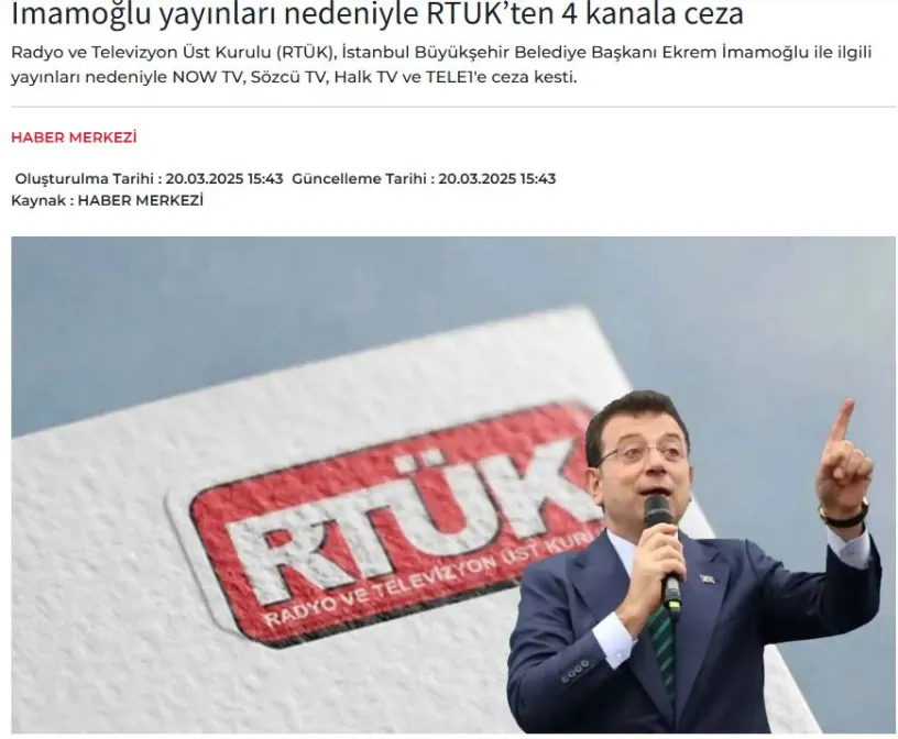 Το Ανώτατο Συμβούλιο Ραδιοφωνίας και Τηλεόρασης της Τουρκίας (RTÜK) επέβαλε πρόστιμο στα NOW TV, Sözcü TV, Halk TV και TELE1 για τις τηλεοπτικές εκπομπές τους σχετικά με τη σύλληψη του Δημάρχου του Μητροπολιτικού Δήμου της Κωνσταντινούπολης Εκρέμ Ιμάμογλου.