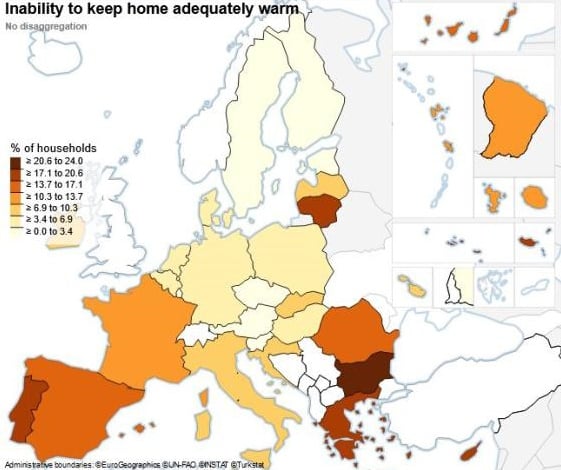Στο παρακάτω χάρτη βλέπουμε ότι στην Ελλάδα κοντά στο 19,6% των νοικοκυριών έχουν περιορισμένη ή και καθόλου χρήση σε πηγές ενέργειας για την θέρμανση τους.Είμαστε στην τρίτη από το τέλος χειρότερη θέση, συγκεκριμένα, είμαστε λίγο καλύτεροι από την Βουλγαρία και την Λιθουανία. Ο μέσος ευρωπαϊκός όρος είναι στο 9,2% , ενώ στις Σκανδιναβικές χώρες ο δείκτης ενεργειακός φτώχειας είναι κάτω από 3,4%.