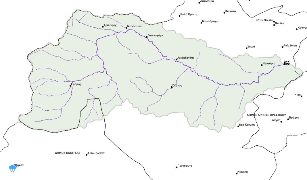 Εικόνα 1. Η απεικόνιση, της «λεκάνης απορροής» (του «“Αλιάκμονα Ποταμού” που αντιστοιχεί έως την θέση στην οποία πρόκειται να κατασκευαστεί το «Φράγμα “Νεστορίου” Ποταμού Αλιάκμονα», του «Δήμου Νεστορίου»), του «υδρογραφικού (γραμμικού) δικτύου» (γραμμές με «έντονη μπλε» απόχρωση), του μετεωρολογικού σταθμού του «Πληκατίου, Δήμου Κόνιτσας» («meteo.gr»), (θεματικό εικονίδιο «σύννεφο με βροχή» με «γαλάζια απόχρωση»), των περιγραμμάτων του «Δήμου Κόνιτσας», του «Δήμου Άργους Ορεστικού» και του «Δήμου Καστοριάς» (διακεκομμένες γραμμές με «μαύρη» απόχρωση) και των οικισμών του «Δήμου Νεστορίου», του «Δήμου Κόνιτσας», του «Δήμου Άργους Ορεστικού» και του «Δήμου Καστοριάς» (κουκκίδες με «μαύρη» απόχρωση), όπως απεικονίζονται στο «ελεύθερο διαδικτυακά λογισμικό» «Q.G.I.S.» [4], μέσω των σχετικών αρχείων που ανακτήθηκαν τόσο από την σχετική διαδικτυακή «πλατφόρμα» («Copernicus») όσο και από την σχετική διαδικτυακή «πλατφόρμα» («ΕΛ.ΣΤΑΤ.»), [1,2,4].